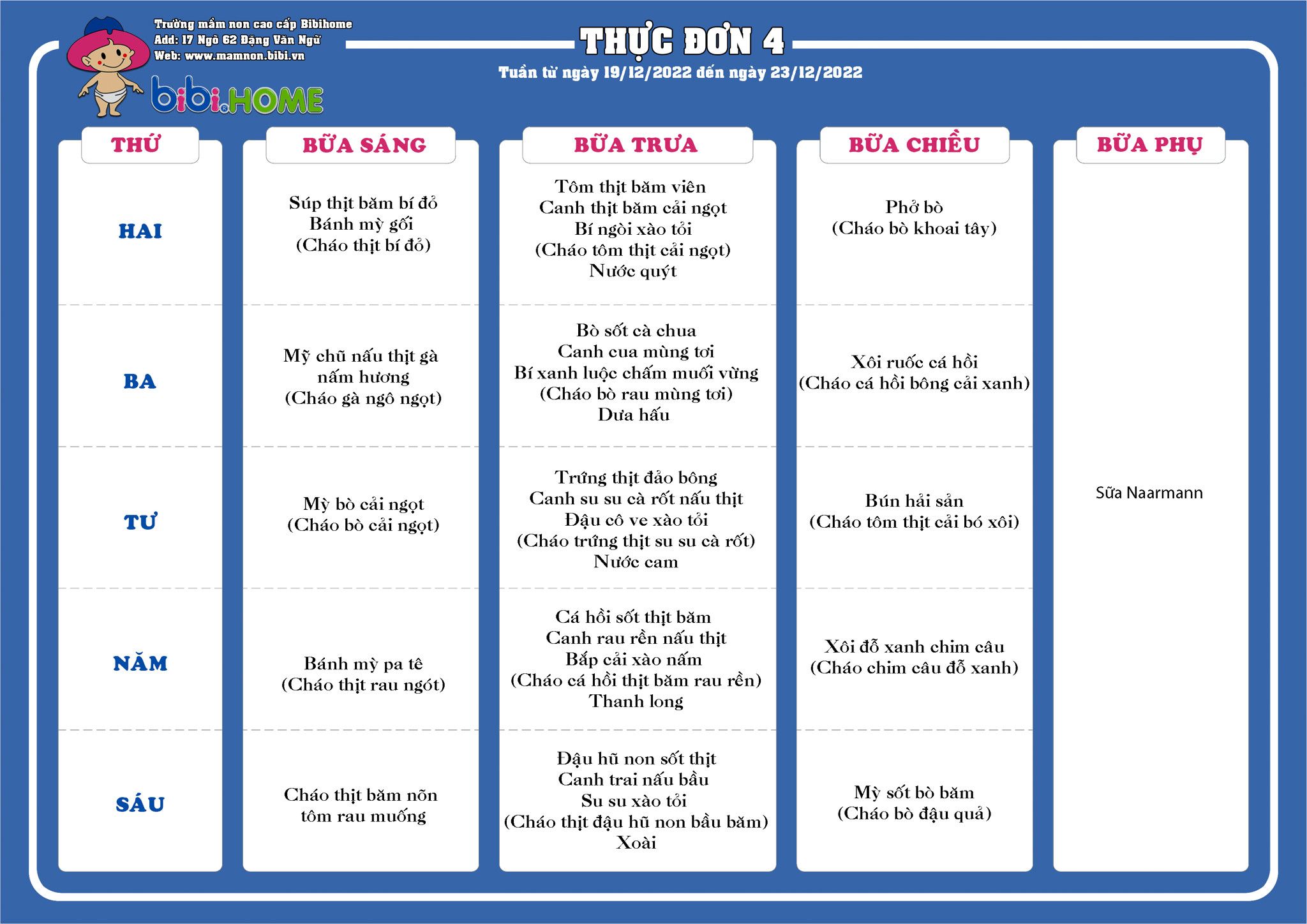 Một tháng, trường sẽ có 4 thực đơn trong 4 tuần để đảm bảo cho học sinh có bữa ăn đầy đủ dinh dưỡng và thực phẩm phong phú. Thực đơn sẽ được thay đổi theo mùa để phù hợp với thực phẩm trên thị trường.